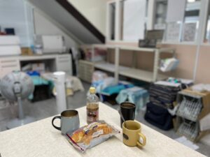 (前日受入れした猫ちゃんたちをバックに朝食風景。・・・え?人間、パンだけ?)