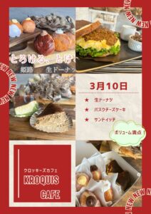 3月は、ご好評につき再来のKROQUIS cafe様#kroquiscafe の生ドーナツやサンドイッチ、そして一押しの、バスクチーズケーキ!!特に珈琲味がおススメだとか💛期間限定の生ドーナツも販売いたします。こちら、売り切れ御免となっておりますのでお早めに~!!!