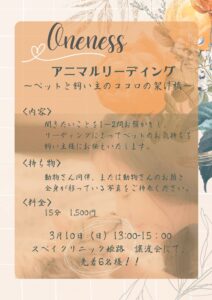 また、繁忙期の中、無理を言ってOneness様#oneness_animal_yoshimi によるアニマルリーディングセッションも開催いたしますよ!!こちら、先着6名様とさせていただいております☆どうぞこの機会に、ペットちゃんとココロで通じ合ってみてください!!