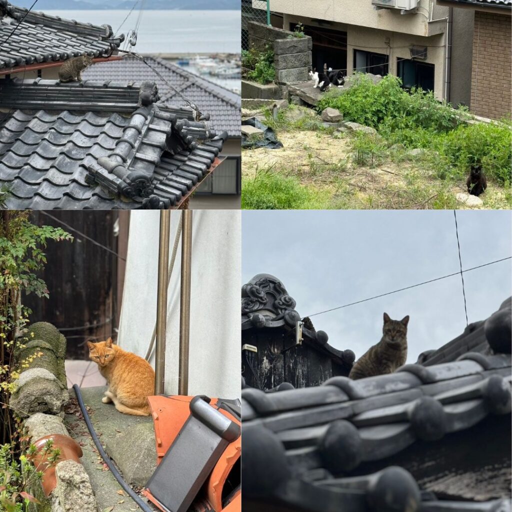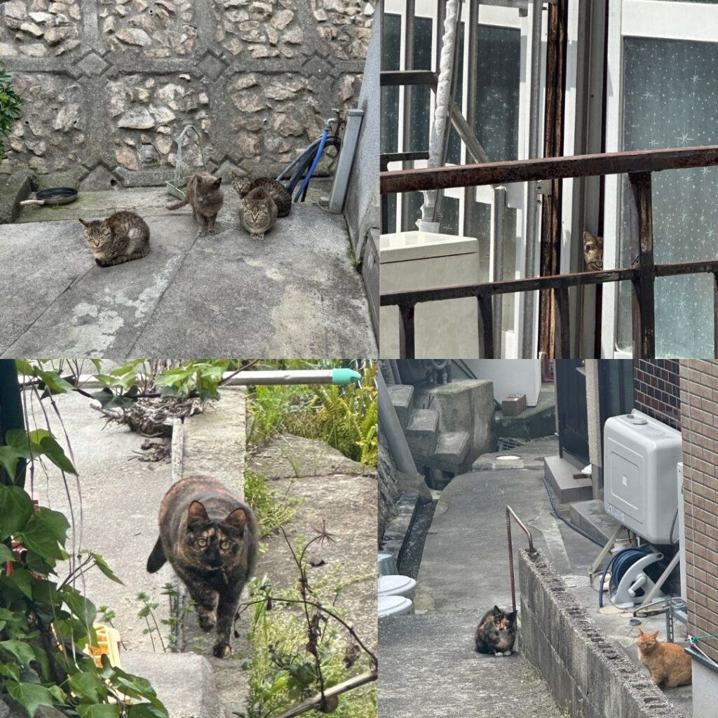 坊勢島は家島同様(もしくはそれ以上)、起伏が激しく細い路地がいっぱい。屋根をつたって縦横無尽にたくさんの猫たちが生息しています。すでにお腹が大きな猫もちらほら。毎年、子猫が生まれ、数が増えていく中で育たない子も数多く、島民の方々も困惑している状況でした。